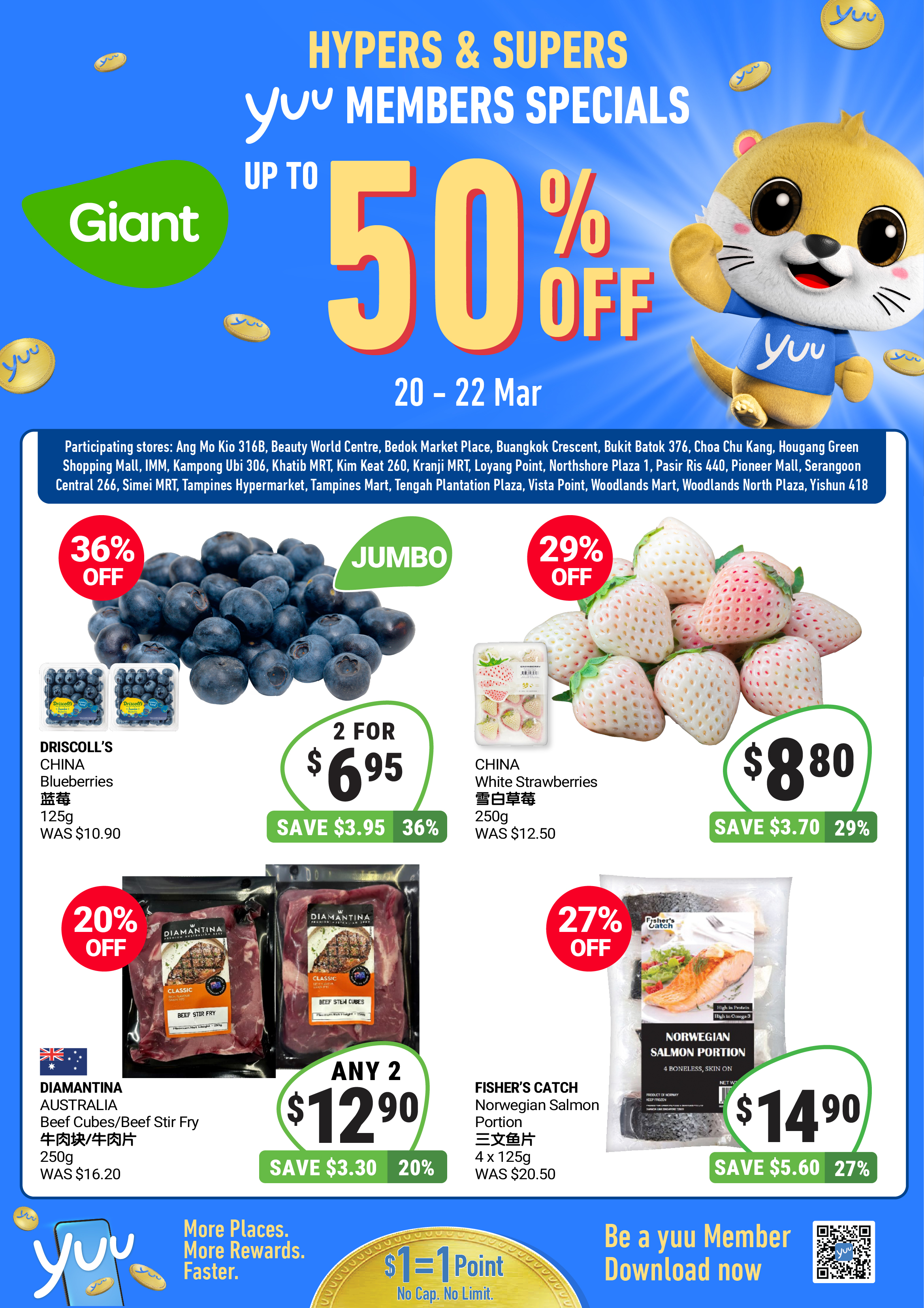 Tampines Hypermarket, IMM, Pioneer Mall, Ang Mo Kio 316B, Beauty World Centre, Bedok Market Place, Buangkok Crescent, Bukit Batok 376, Choa Chu Kang, Hougang Green Shopping Mall, Kampong Ubi 306, Khatib MRT, Kim Keat 260, Kranji MRT, Loyang Point, Northshore Plaza 1, Pasir Ris 440, Serangoon Central 266, Simei MRT, Tampines Mart, Tengah Plantation Plaza, Vista Point, Woodlands Mart, Woodlands North Plaza, Yishun 418